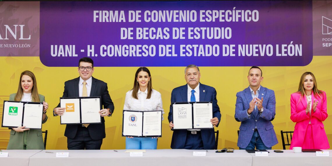 La Presidenta del Congreso local, Lorena de la Garza, encabezó la firma de renovación del convenio de becas con la Universidad Autónoma de Nuevo León (UANL), con el propósito de que más jóvenes de preparatoria y universidad tengan la oportunidad de continuar con su formación académica.
