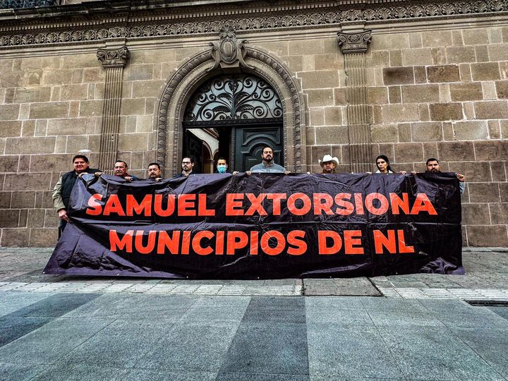 Con una enorme lona que rezaba “Samuel extorsiona municipios de NL”, los alcaldes denunciaron que los retrasos se tratan de una presión y estrategia electoral.