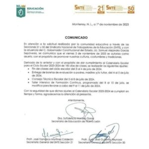 “En atención a la solicitud realizada por la comunidad educativa a través de las secciones 21 y 50 del Sindicato Nacional de Trabajadores de la Educación (SNTE) y con la anuencia del Gobernador Samuel García, se comunica que el viernes 3 de noviembre del 2023 se autoriza como asueto con el propósito de promover nuestras cultura, costumbres y tradiciones”, se lee en el comunicado.