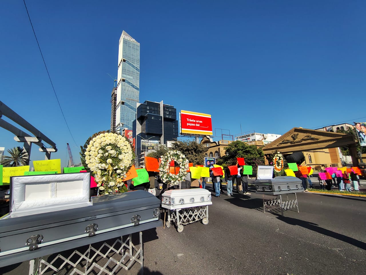 Los manifestantes colocaron tres ataúdes y coronas florales sobre los carriles centrales de Constitución, como muestra de su malestar por la insolencia de las aseguradoras en la cobertura de las pólizas de accidentes de sus familiares.