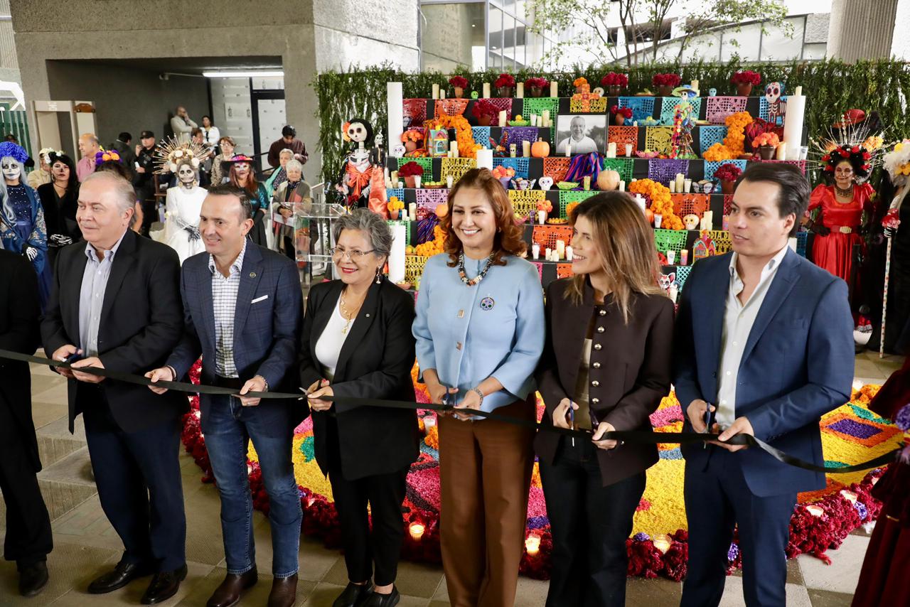 El altar incluyó fotografía del homenajeado, papel picado, flores, veladoras, pan de muerto, calaveras de azúcar y catrinas de papel, símbolos de la tradición mexicana que honran su legado y mantienen viva su memoria.