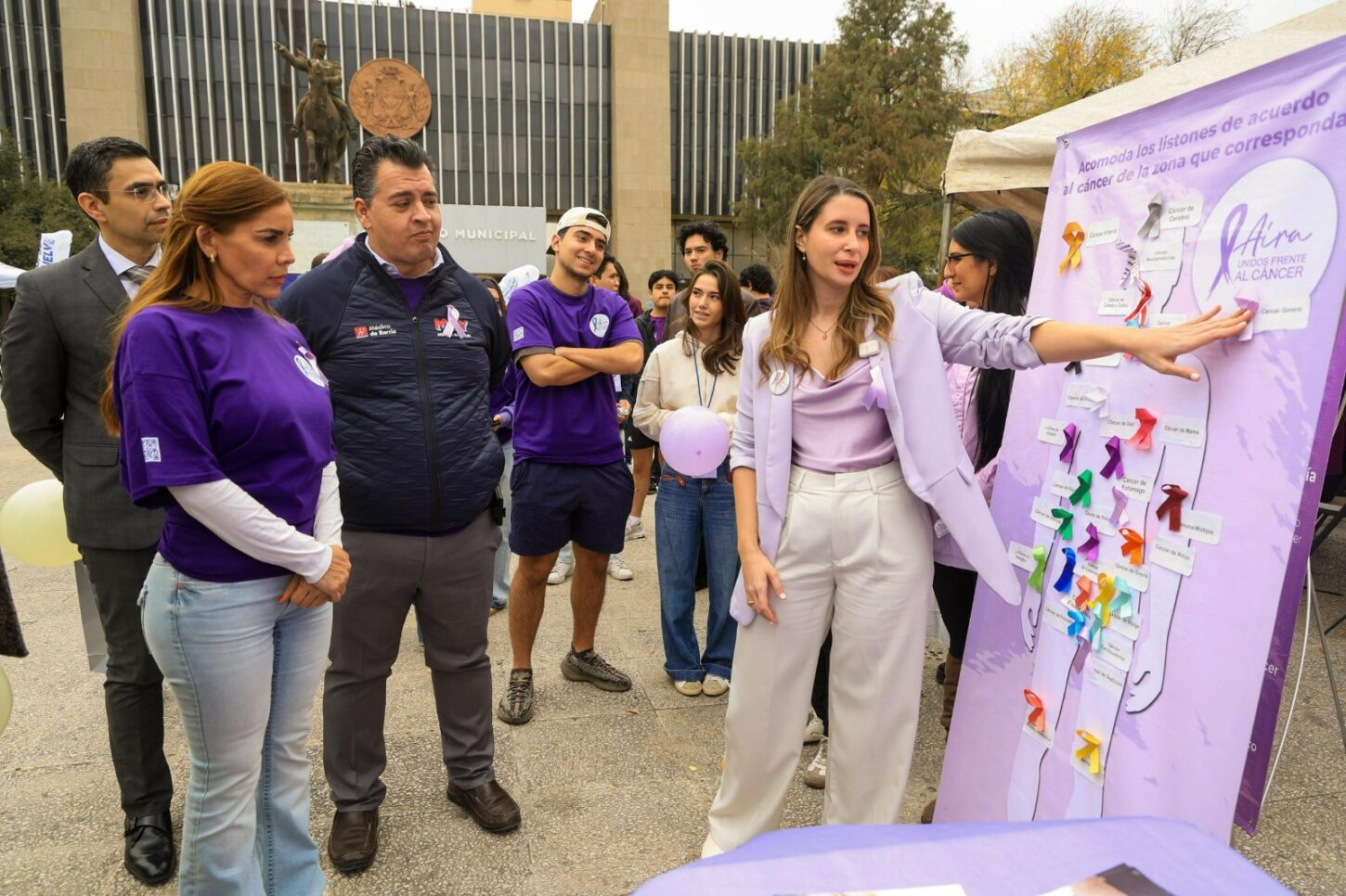 Como acto simbólico de solidaridad, las y los asistentes formaron una figura con globos lilas y amarillos, colores que representan la lucha contra el cáncer, enviando un mensaje de apoyo y esperanza a pacientes y sobrevivientes.