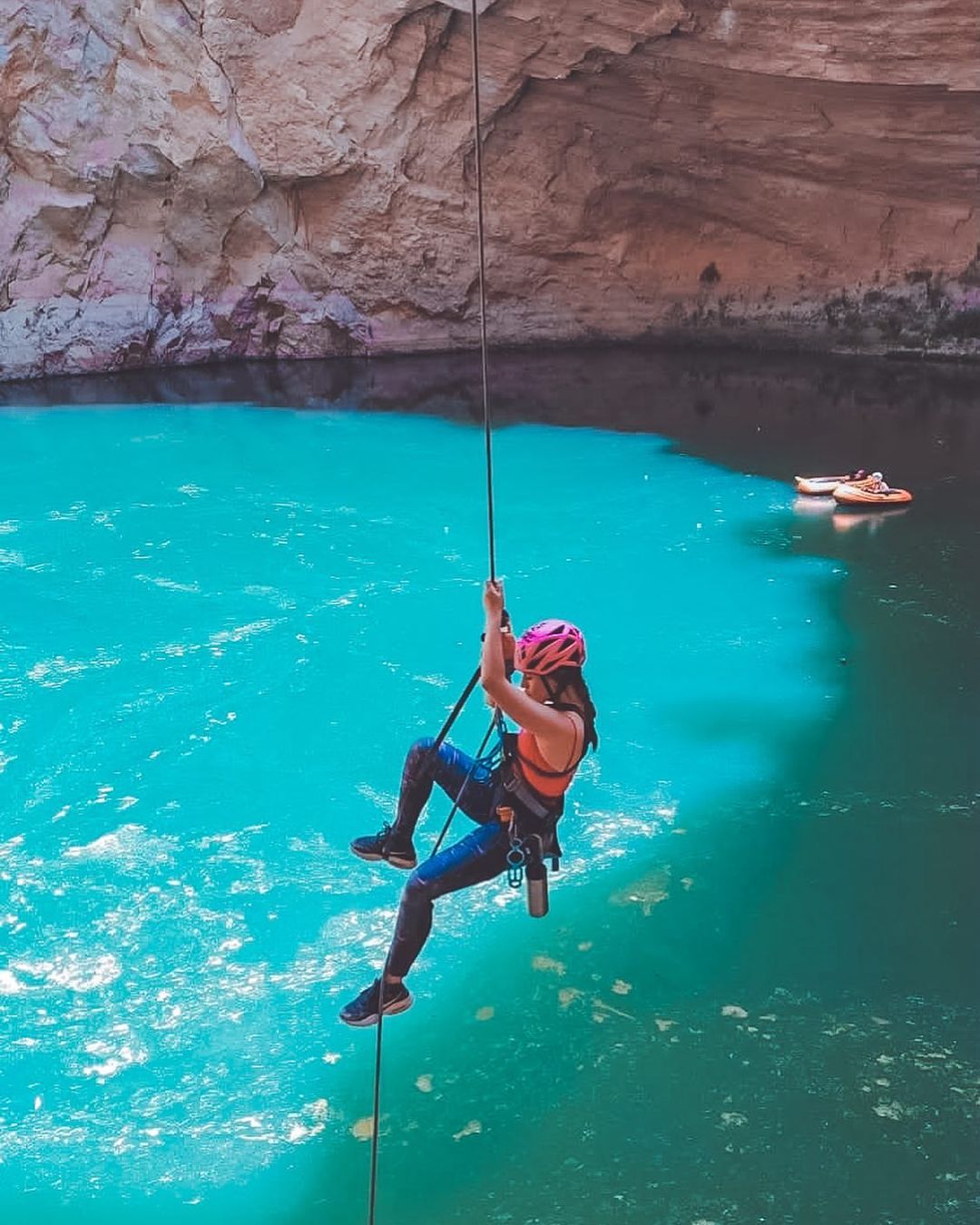Mujer practicando rapel en el pozo del gavilán