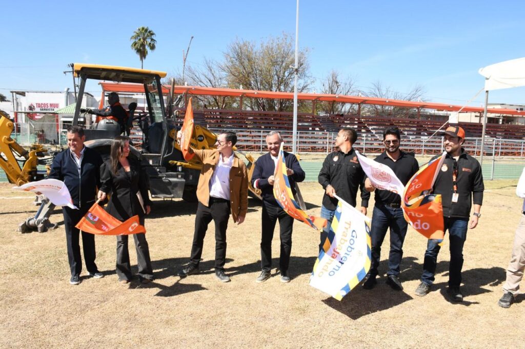 El senador Luis Donaldo Colosio, el alcalde Héctor García y el director de la Fábrica de Escuelas, Luis Fernando Domínguez Martín del Campo, supervisaron los primeros trabajos de esta obra que beneficiará a cientos de estudiantes y atletas de la región.