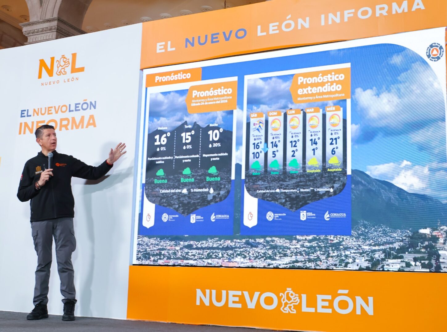 El funcionario detalló que una masa de aire ártico procedente del sur de Texas impactará la entidad, con temperaturas mínimas de 2 a 4 grados centígrados, e incluso amaneceres cercanos a los 0 grados, mientras que las máximas oscilarán entre 10 y 12 grados en el área metropolitana.
