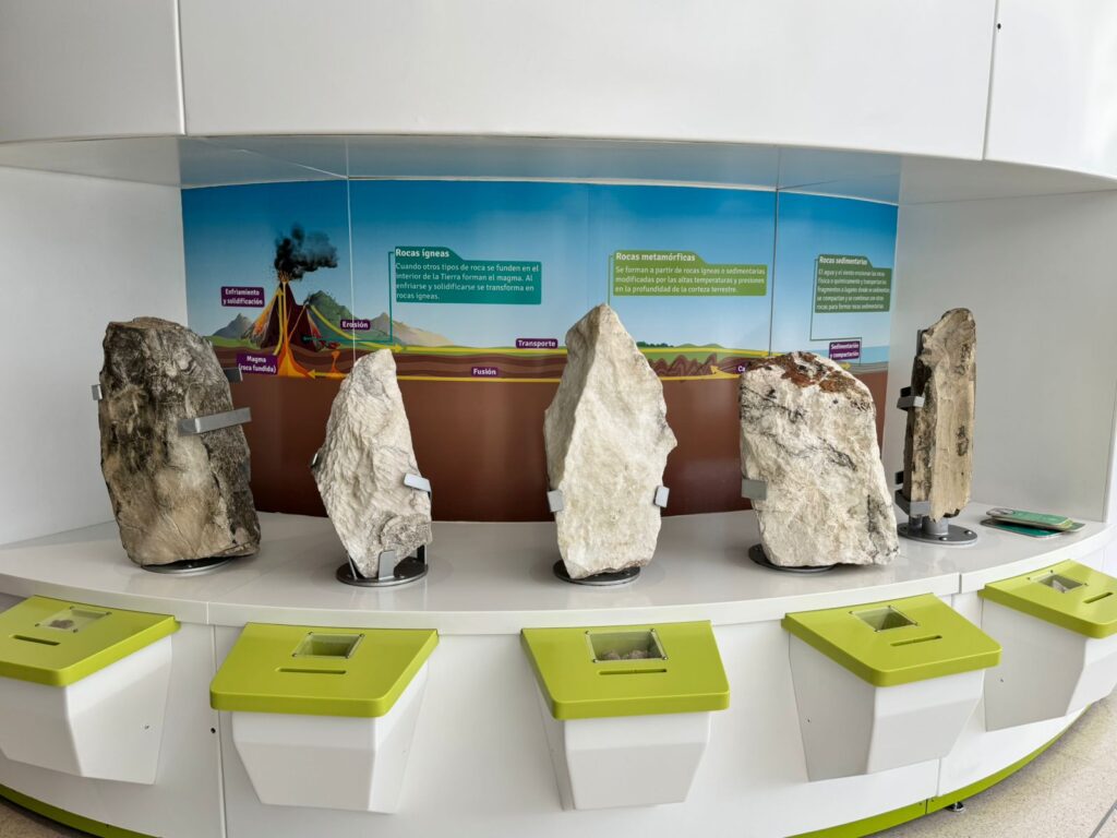 Dentro del museo, un stand auspiciado por la Cámara Minera de México (CAMIMEX) introduce de manera clara y accesible los tipos de roca, con ejemplos de calizas y lutitas, así como minerales como la barita, el talco y el yeso.