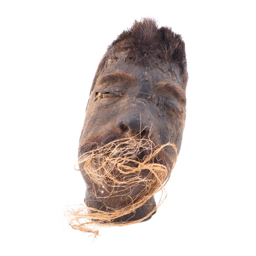 Uno de los objetos más llamativos será una tzantza o cabeza reducida (15×6×10 cm), proveniente del pueblo shuar de la Amazonia. La pieza conserva rasgos faciales definidos, con ojos y labios cosidos con fibra vegetal, un sello característico del ritual shuar para impedir que el espíritu enemigo escapara.