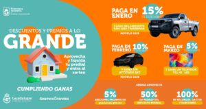Adicional a eso, el gobierno municipal ofrece 50 por ciento en rezagos del predial y 100 por ciento en recargos, gastos y sanciones, además de un 5 por ciento al pagar vía electrónica en la ventanilla virtual del Municipio en el siguiente link https://webservice.guadalupe.gob.mx/predial.