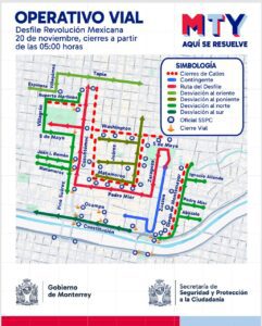 Con motivo del desfile cívico-deportivo por el 114 Aniversario de la Revolución Mexicana, la Dirección de Vialidad y Tránsito de Monterrey implementará un operativo vial, que contempla cierres en un día hábil, en calles del Centro de la Ciudad.