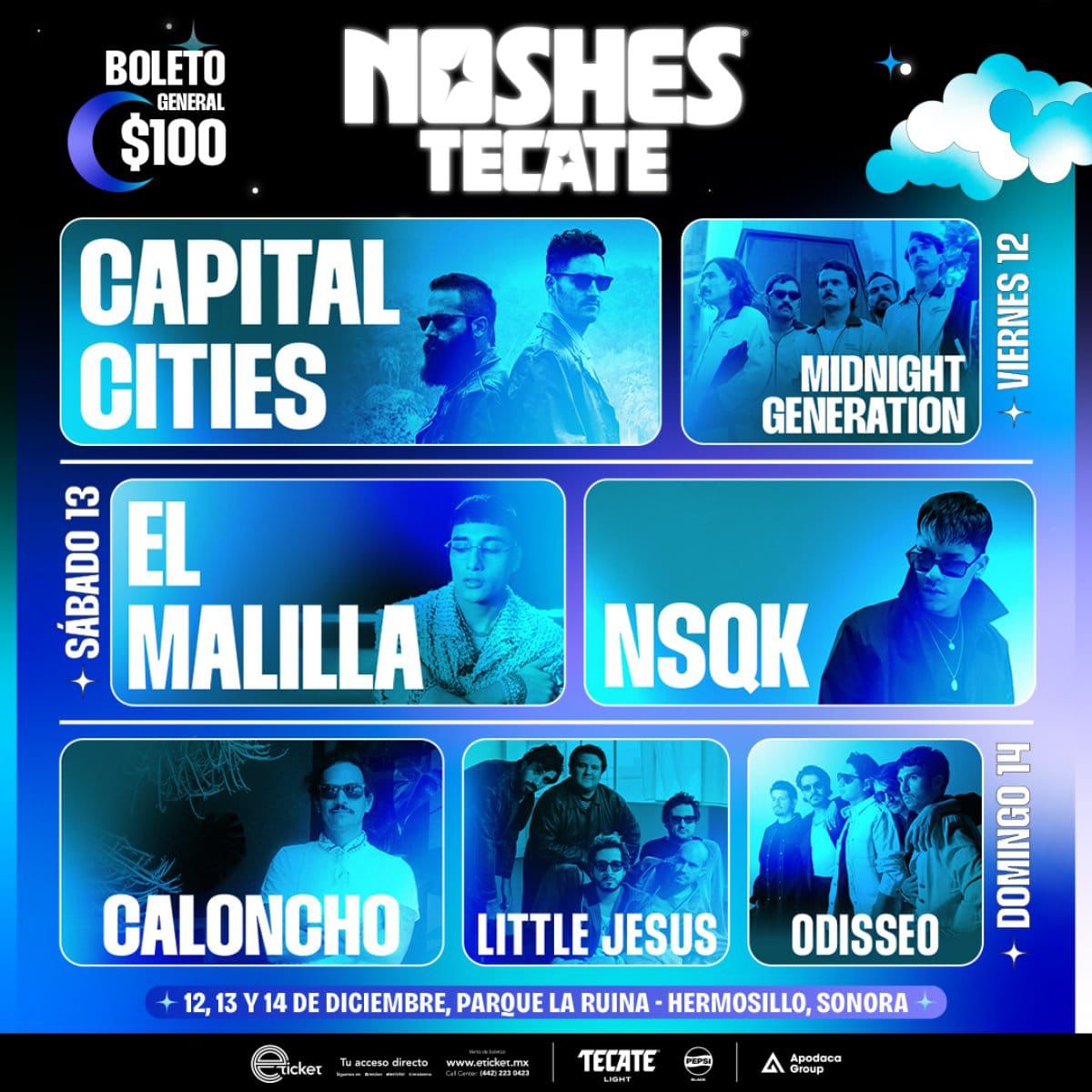 La programación se desarrolló a lo largo de tres noches. El viernes 12 destacó la presencia de Capital Cities, acompañados por el proyecto sonorense Midnight Generation. El sábado 13, el escenario fue tomado por El Malilla y NSQK, exponentes clave de la nueva ola urbana en México. Finalmente, el domingo 14, el festival cerró con Caloncho, Little Jesus y Odisseo, referentes del indie nacional.
