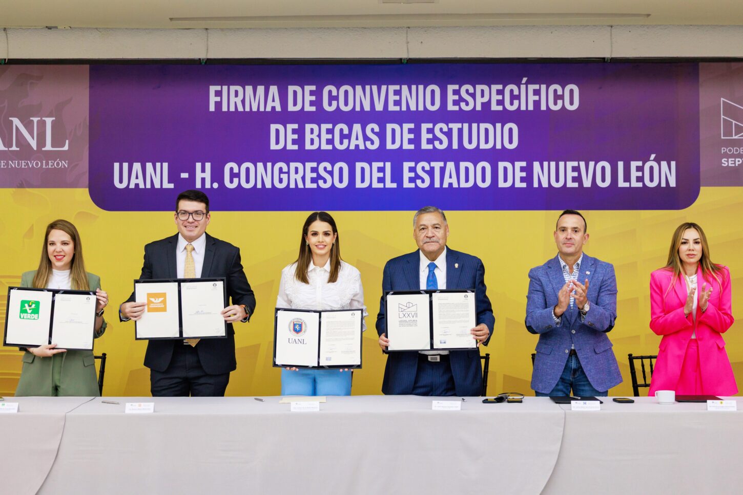 La Presidenta del Congreso local, Lorena de la Garza, encabezó la firma de renovación del convenio de becas con la Universidad Autónoma de Nuevo León (UANL), con el propósito de que más jóvenes de preparatoria y universidad tengan la oportunidad de continuar con su formación académica.