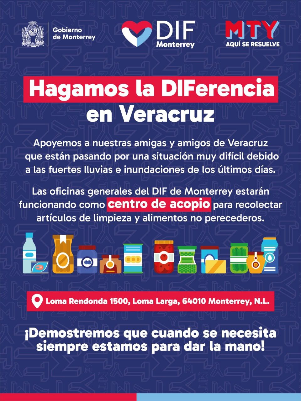 El punto de recolección está ubicado en las oficinas generales del DIF Monterrey, en Calle Loma Redonda #1500, Colonia Loma Larga, y permanecerá abierto las 24 horas para recibir artículos de limpieza y alimentos no perecederos.