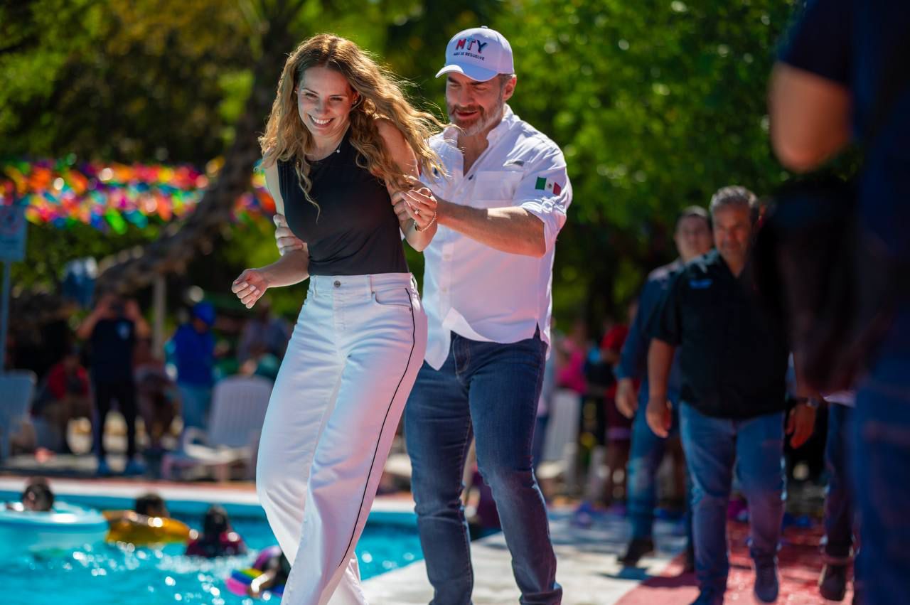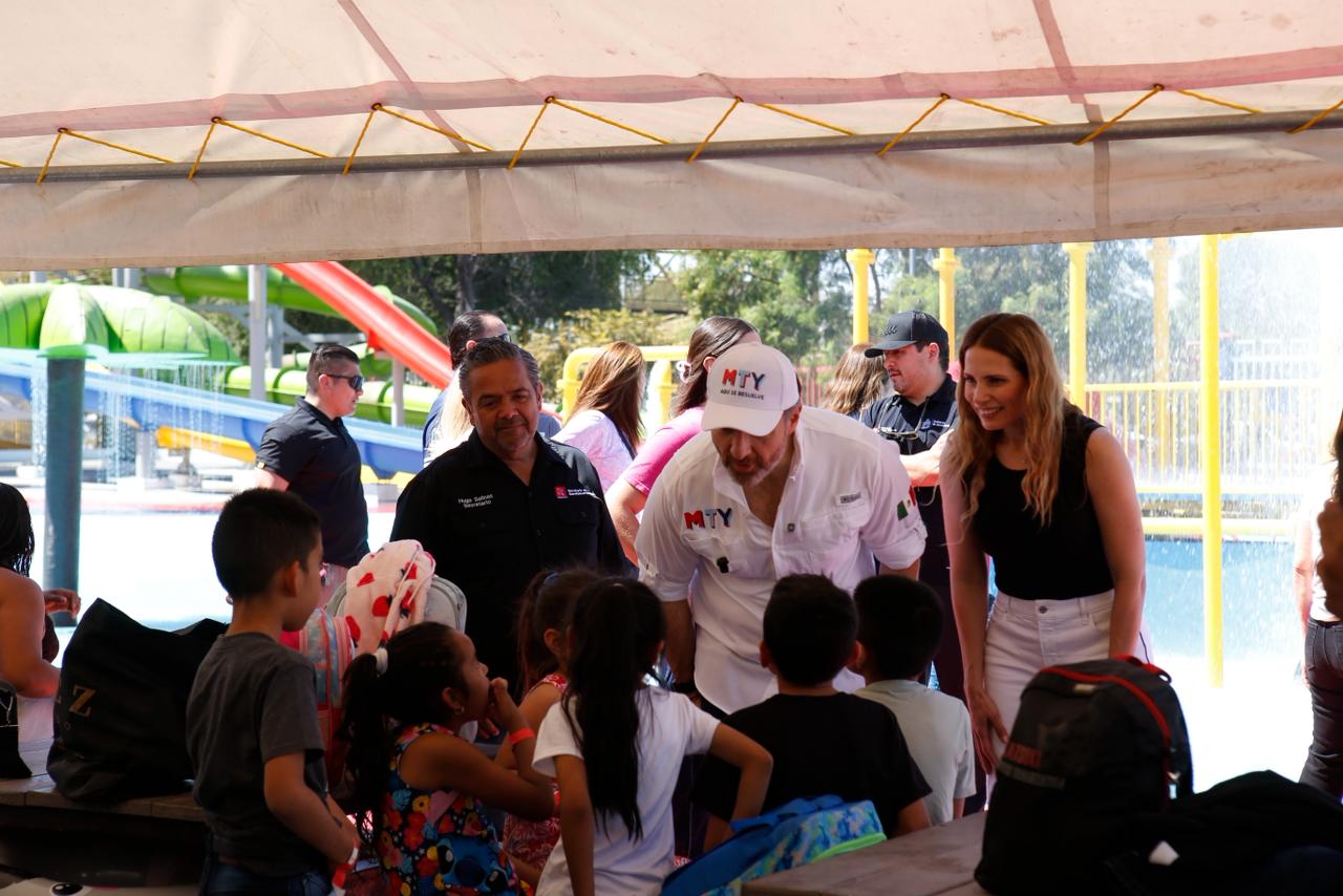El arranque fue encabezado por el alcalde Adrián de la Garza, acompañado por la presidenta del DIF, Gaby Oyervides, quienes acudieron al Parque España para la apertura simultánea de los balnearios.