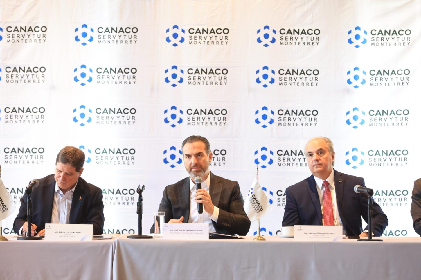 El alcalde de Monterrey, Adrián de la Garza Santos, participó como orador huésped en la sesión del Consejo Directivo de la Cámara Nacional de Comercio (Canaco) de Monterrey, donde presentó los avances del primer año de su administración y firmó un acuerdo de colaboración con el presidente del organismo, Jaime Herrera Casso, con el propósito de fortalecer la cooperación institucional y el crecimiento económico de la ciudad.