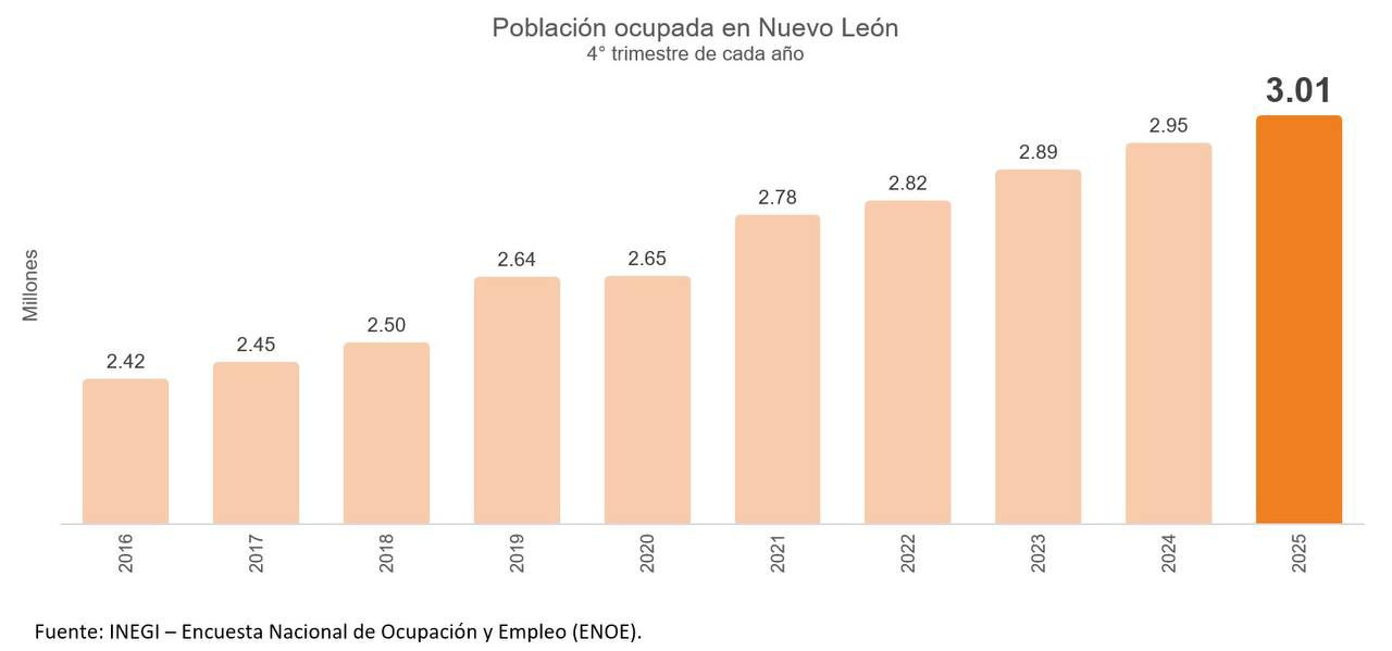 Por primera vez en su historia, Nuevo León rebasó los 3 millones de personas ocupadas, al registrar 3.01 millones en el cuarto trimestre de 2025, de acuerdo con la Encuesta Nacional de Ocupación y Empleo.
