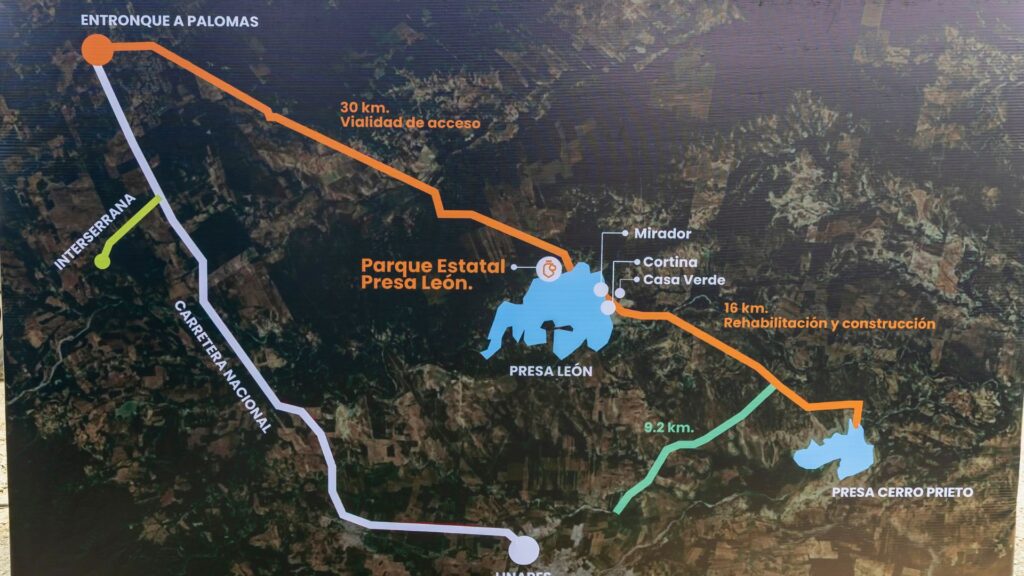 El proyecto contempla también 30 kilómetros de carretera para conectar la presa con el Entronque a Palomas, así como la rehabilitación de 16 kilómetros adicionales para enlazar con la Presa Cerro Prieto, mejorando la movilidad hacia las Carreteras Interserrana y Nacional.
