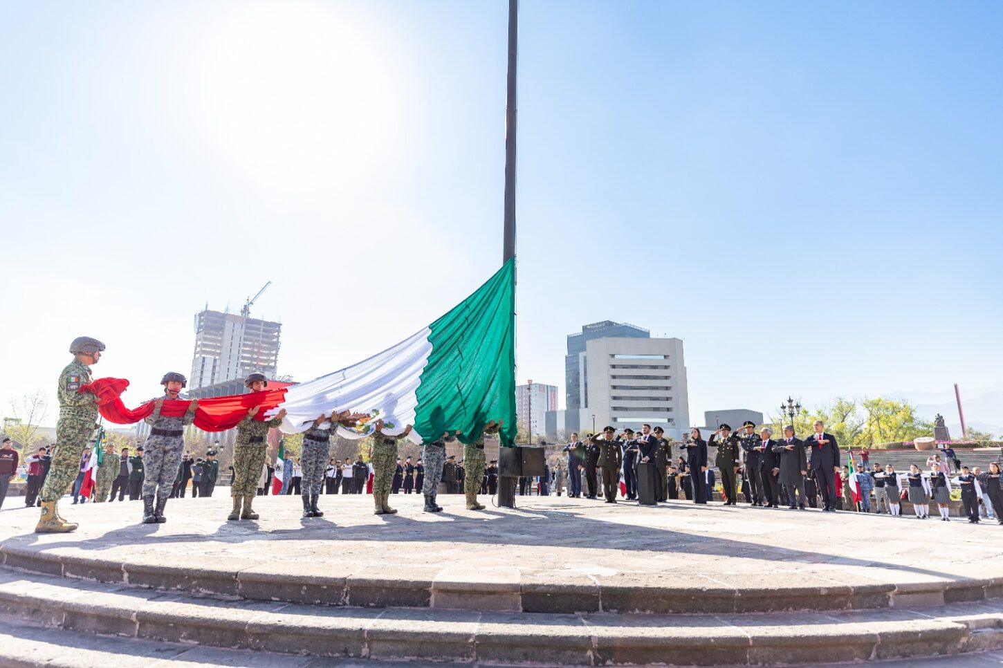 “Honrar la bandera es trabajar todos los días por la educación, por más oportunidades y para que Nuevo León siga siendo el motor de México”, expresó.