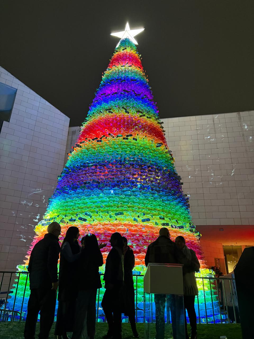 El Encendido del Pino, una tradición que simboliza el inicio de la Navidad en Nuevo León, presentó nuevamente la pieza diseñada por Sergio Rodríguez, inspirada en los sarapes mexicanos y en su riqueza cromática y cultural.