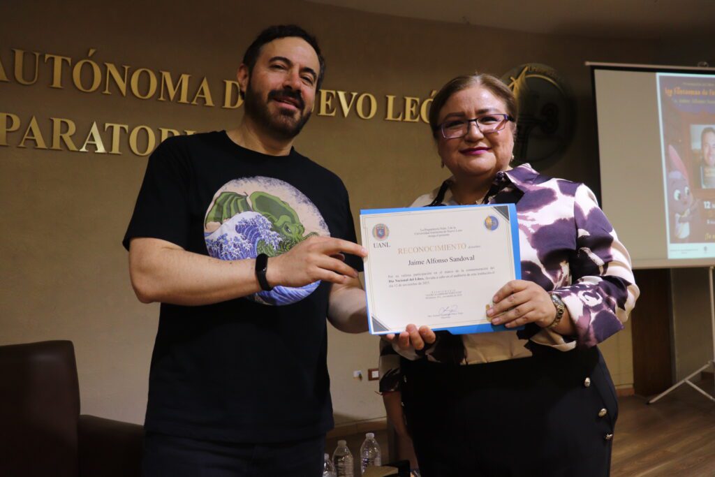 En el marco del Día Nacional del Libro, la Preparatoria 3 de la Universidad Autónoma de Nuevo León (UANL) recibió al escritor Jaime Alfonso Sandoval, reconocido autor de literatura infantil y juvenil, quien sostuvo un encuentro con estudiantes para dialogar sobre la lectura, la escritura y los temas que abordan sus obras.