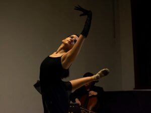 Para cerrar la noche, la Sala Alfonso Reyes albergó el espectáculo multidisciplinario “Romances de una cellista“, protagonizado por la artista Brenda Elizondo, acompañada por José María López al violonchelo y Adriana Oliveira en la danza. La obra narra la historia de Catalina, una joven cellista que explora el amor, la pasión y el dolor, acompañada de su inseparable violonchelo Florentino, dotado de personalidad propia.